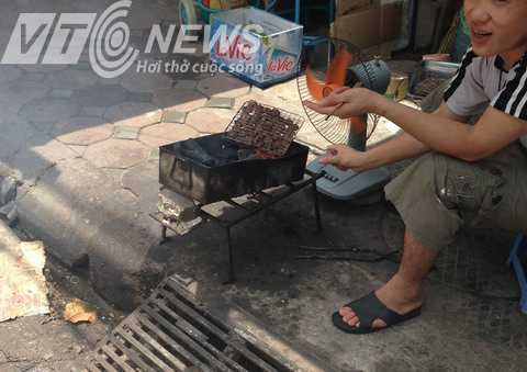 Người quạt chả dùng tay không để xếp thịt vào những chiếc vỉ đen đen bẩn bẩn, còn dính nguyên thịt thừa của những mẻ trước. Đến ngay cả chủ hàng cũng bốc chả bằng tay trần cho vào từng suất ăn cho thực khách.