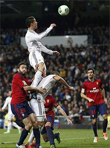 Hình ảnh ghi lại cho thấy, CR7 bật cao tới bụng một hậu vệ Osasuna