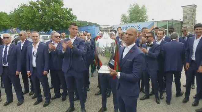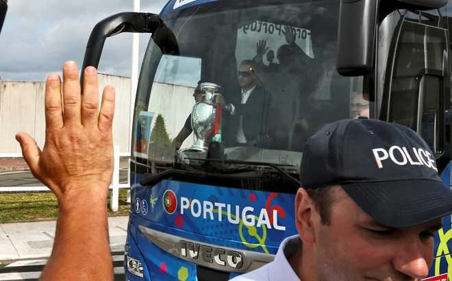 ![]() Thủ quân Bồ Đào Nha khoe cúp Euro 2016 với người hâm mộ trước khi lên đường về nước. |