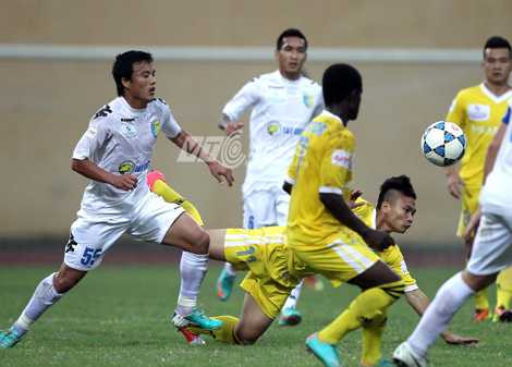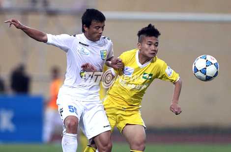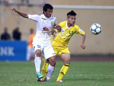 | Phi Sơn (vàng) bị Văn Biển của Hà Nội T&T bắt chặt (Ảnh: Quang Minh) |