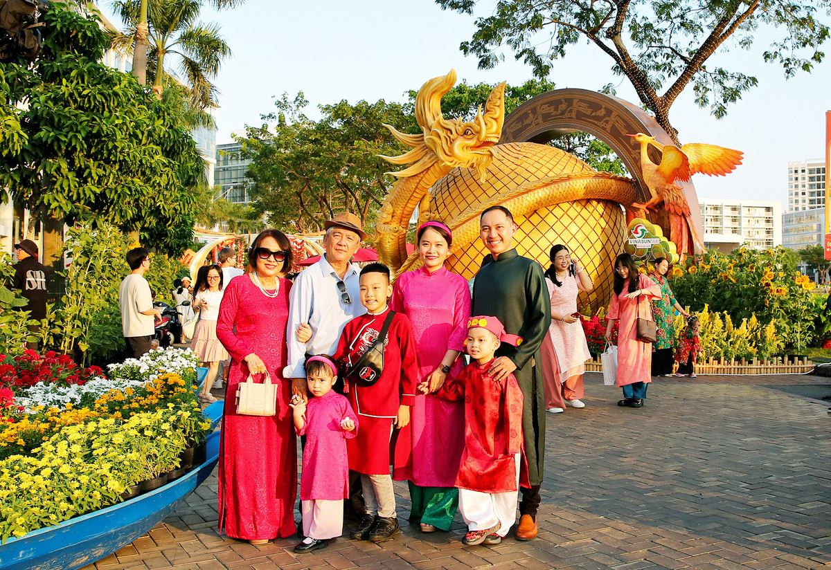 Đường hoa Phú Mỹ Hưng, quận 7, TP.HCM mang chủ đề "Xuân sum vầy" có chiều dài gần 700 m với mong muốn hướng đến cội nguồn văn hóa Việt trong dịp tết cổ truyền của dân tộc. Đó còn là lời chúc sum vầy, đoàn viên gửi đến khách du xuân khi tết đến xuân về.