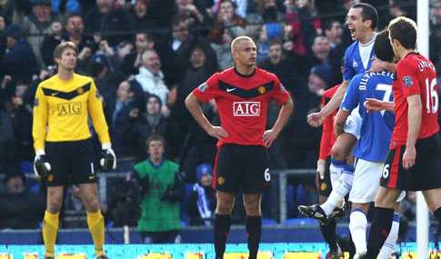 Với ưu thế vượt trội về lực lượng và đẳng cấp, không có gì khó hiểu khi MU là đội chiếm thế chủ động trong những phút đầu tiên của trận đấu. Tuy nhiên, Everton đang có phong độ tốt, từng đánh bại Chelsea, Man City và cầm hòa Arsenal, không phải là đội bóng dễ bị át vía, nhất là khi được thi đấu trên sân nhà. Lối chơi ăn miếng trả miếng, sẵn sàng đáp trả đã được HLV David Moyes sử dụng để đối đầu với đội bóng của người đồng hương Scotland, đàn anh Alex Ferguson. Phút 14, Saha cảnh cáo đội bóng cũ bằng một cú sút xa nguy hiểm, khiến Van der Sar phải vất vả cản phá.