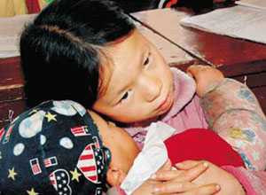 | Cô bé Ning Yexiang bồng em đến lớp (Ảnh: Beijing Times) |