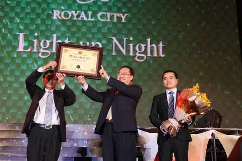 | Ông Trần Lê Phương - Tổng giám đốc Công ty CP Đầu tư và Phát triển Địa ốc Thành phố Hoàng Gia (giữa) nhận Chứng nhận kỷ lục “Cây thông Giáng sinh lớn nhất Việt Nam” từ Đại diện của Tổ chức Kỷ lục Việt Nam, Ông Trần Chiến Thắng - Nguyên thứ trưởng Bộ Văn hóa, Thể thao VÀ Du lịch - Phó chủ tịch Hội kỷ lục gia Việt Nam (trái). |