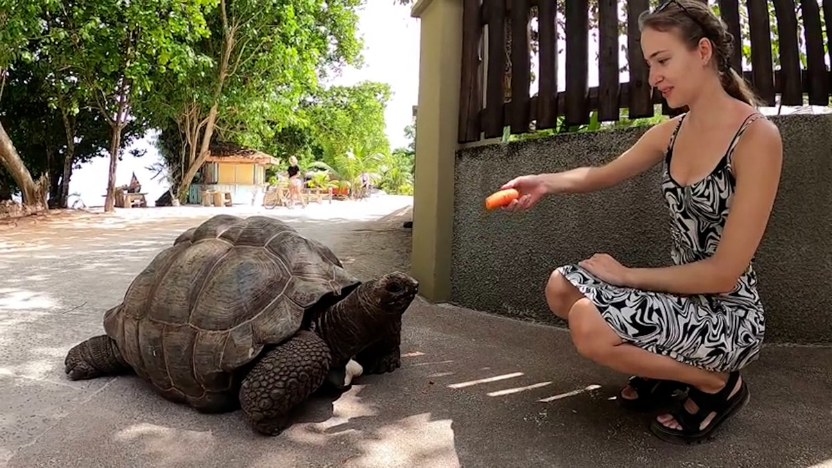 Du khách vô cùng thích thú khi được "giao lưu" với chú rùa Adam 125 tuổi đang lang thang trên phố tại đảo La Digue, Cộng hòa Seychelles.