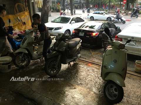 Tại các cửa hàng trong khu vực nội thành Hà Nội, dù giá rửa xe tăng cao so với ngày thường nhưng số lượng xe máy và ô tô xếp hàng chờ rửa vẫn khá đông.