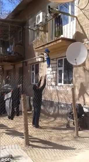 bà mẹ người Kazakhstan này đã liều lĩnh thả cậu con trai mới 18 tháng tuổi từ ban công tầng hai xuống dưới đất để ông bố ở dưới đỡ.