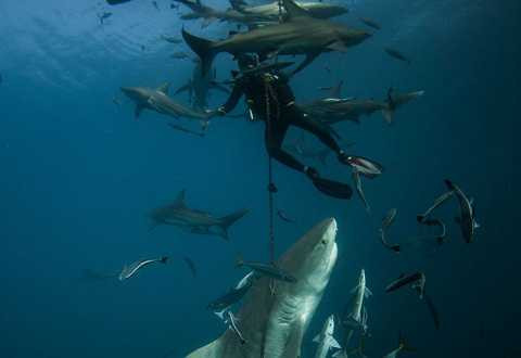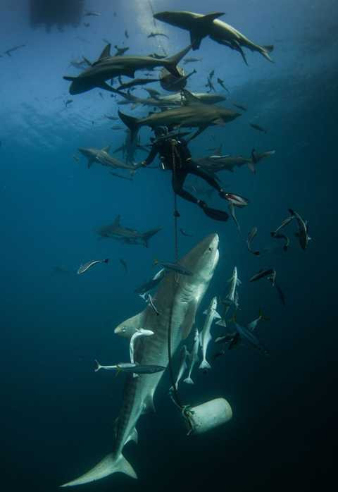 Trong khi bị một đàn cá mập hổ nguy hiểm và cá mập vây đen bao quanh nhưng các thợ lặn vẫn hết sức bình tĩnh mặc dù không hề có dụng cụ bảo hiểm.