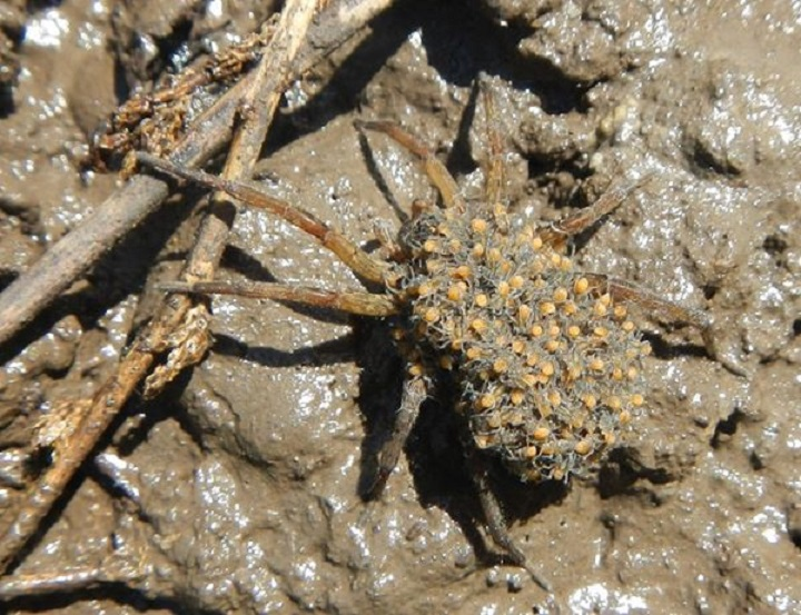 Nhện sói mẹ "cõng" đàn con trên lưng. (Ảnh: Facebook)