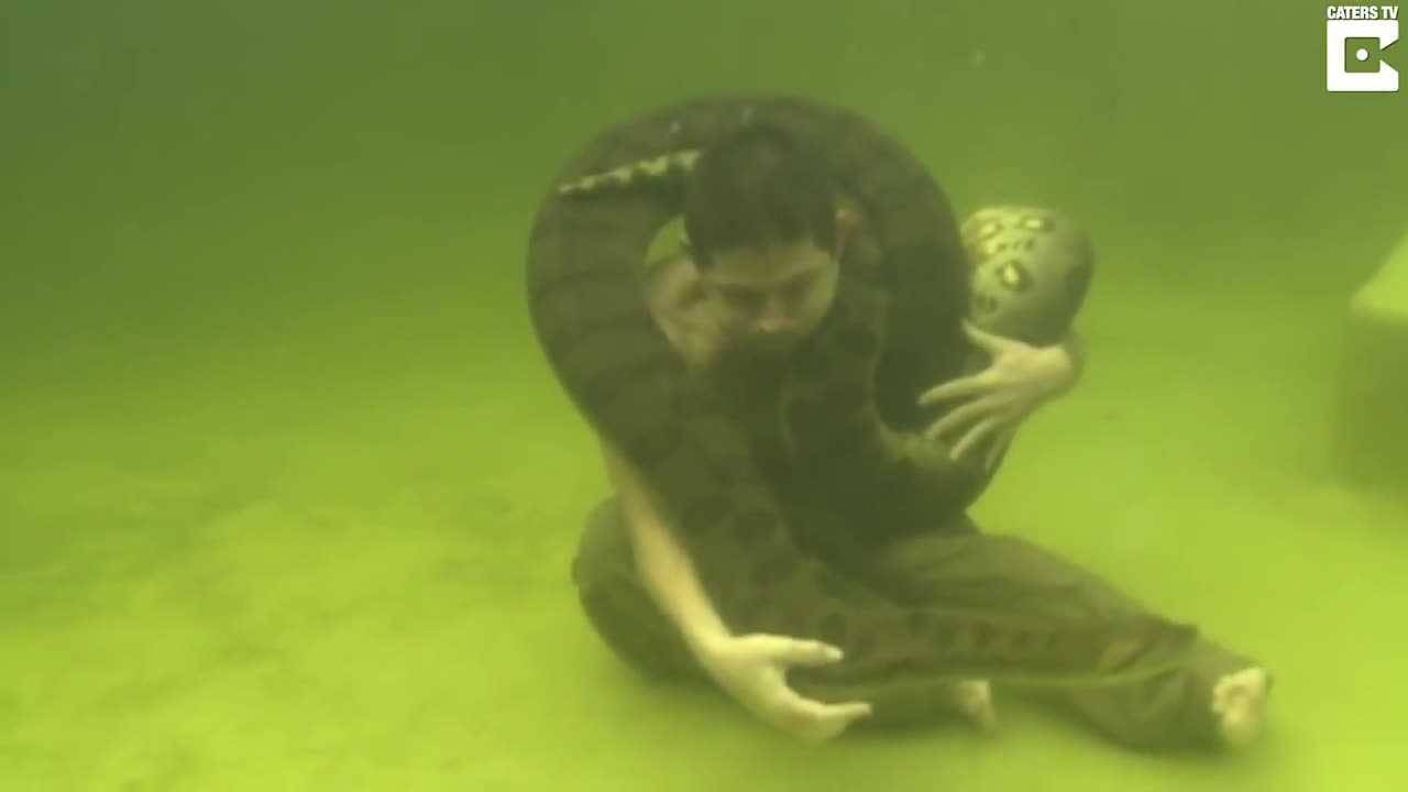 Clip ghi lại cảnh một người đàn ông quấn con trai anaconda dài gần 4 mét quanh cổ và cùng nó lặn xuống dưới nước.