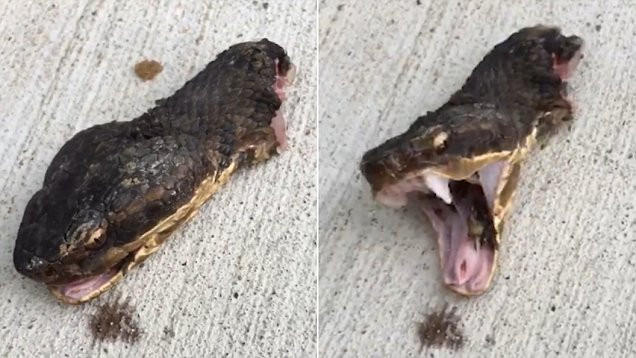 Con rắn Cottonmouth cực độc mò vào vườn nhà dân ở thị trấn Sunnyvale, bang Texas, Mỹ, bị gia chủ dùng kìm tỉa cây kết liễu nhưng dù mất đi phần lớn cơ thể, con vật vẫn hung hãn nhe nọc dọa dẫm khiến người xem rùng mình.