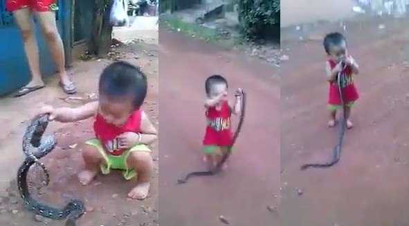 Thậm chí có lúc bé trai trong clip còn cầm hẳn đuôi rắn cho lên miệng định cắn nhưng người lớn đã kịp thời ngăn lại.