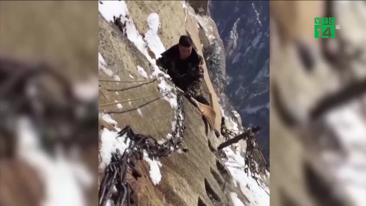 Trên con đường ván gỗ bắt vít vào vách đá núi Huashan, tỉnh Shaanxi, Trung Quốc nằm ở độ cao hơn 2000 m so với mực nước biển, dọn tuyết là công việc cực kỳ nguy hiểm, ai nhìn vào cũng phải rùng mình.