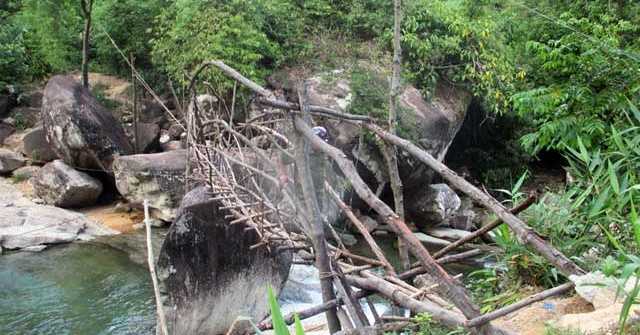 | Dù cây cầu không quá cao, nhưng dưới suối nước luôn chảy xiết và nhiều đá lởm chởm |