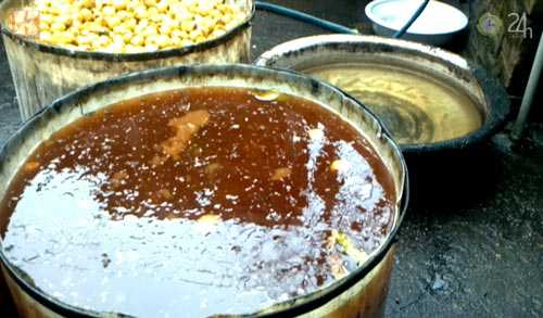 Bể nước đường và mật dùng để chế biến mứt sủi bọt, bốc mùi chua, một số thùng mật đầy rẫy ruồi nhặng nhưng vẫn được sử dụng để trộn mứt.