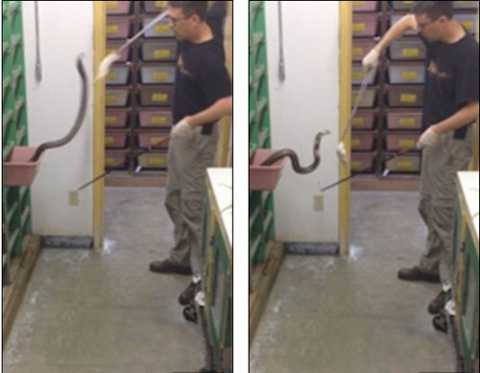 | Cảnh tượng Justin cho rắn hổ mang ăn. |