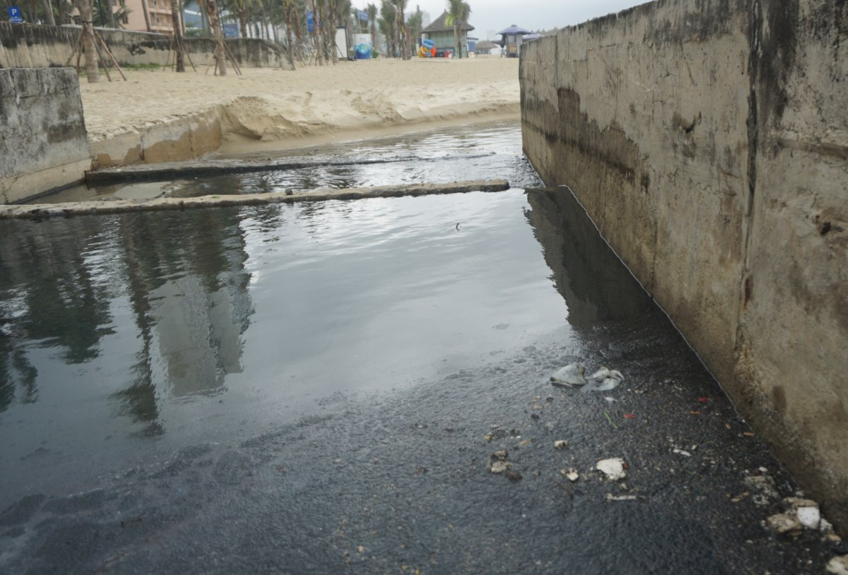 Vào sáng và trưa 7/4, nhiều người dân và du khách tham quan, tắm biển ở vùng biển Mỹ Khê (quận Ngũ Hành Sơn, Đà Nẵng) hốt hoảng khi nhìn thấy dòng nước thải đen ngòm từ các cửa xả thải chảy tràn ra bãi biển.