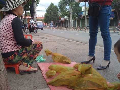 | Người phụ nữ đang rao bán bao rắn lục cho khách trên đoạn đường Nguyễn Ái Quốc, phường Tân Biên, TP Biên Hòa. |