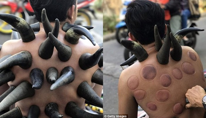 Trên những con phố của thủ đô Jakarta, có thể dễ dàng bắt gặp hình ảnh nhiều người cởi trần với những chiếc sừng trâu ốp trên lưng.