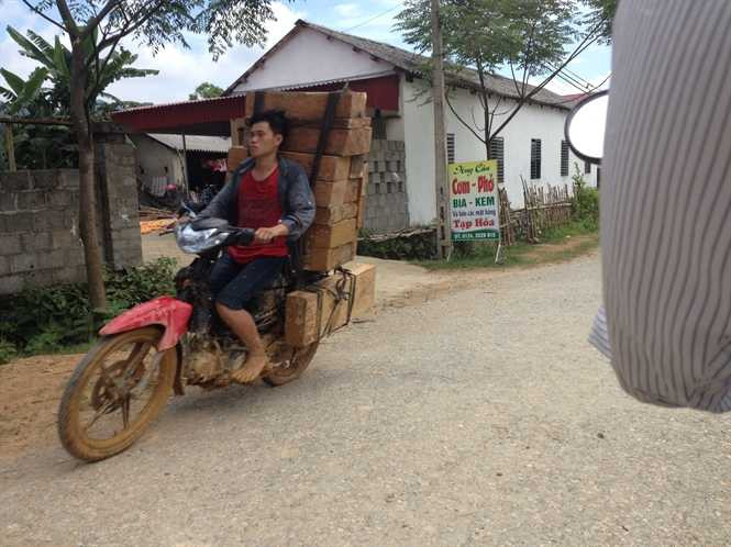 Từ con dốc xa xa, một tốp 7 xe máy lầm lũi tiến lên, những người này vẫn cười nói rôm rả. Đằng trước, đằng sau, hai bên, gỗ nghiến được chằng chặt bằng dây cao su trên khung sắt. Gỗ được xẻ thành từng khúc nhỏ như chiếc hộp, rồi thành thớt. Chắc chắn đây là những cây gỗ nghiến lâu năm, đường kính thân cây lớn. Mỗi xe như vậy chở được vài mét khối gỗ nghiến cho mỗi chuyến.