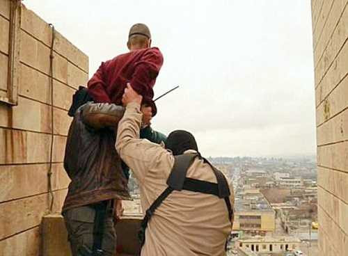 2 chiến binh IS trói tay, bịt mắt và ép 2 người đàn đông đến gần lan can của một tòa nhà cao tầng sau đó đẩy họ xuống đất.