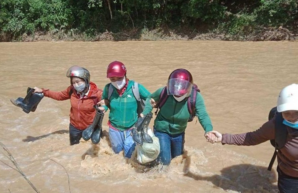 Mưa lũ ảnh hưởng nặng nề, giáo viên phải lội suối, băng rừng đến trường.