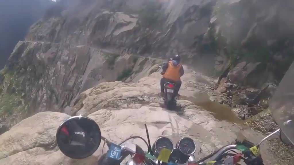 Cảnh phóng môtô vèo vèo trên con đường nguy hiểm nhất hành tinh ở Ấn Độ với một bên là vách đá dựng đứng, một bên là vực sâu thăm thẳm khiến người xem muốn rụng tim vì sợ hãi.