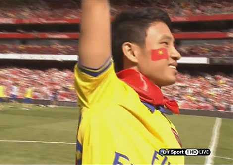 | Vũ Xuân Tiến đã thực hiện được mong muốn xuống sân Emirates và khoác cờ Việt Nam chạy quanh sân. |