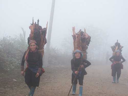 | Phụ nữ vùng cao gùi củi về nhà để sưởi ấm |