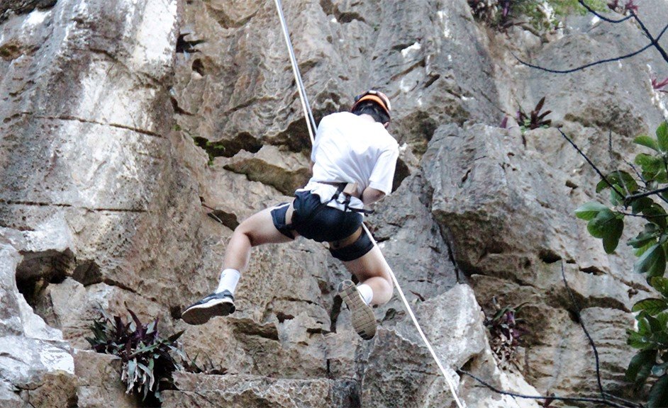 Du khách tham gia tour mạo hiểm leo núi tại Ngũ Hành Sơn.