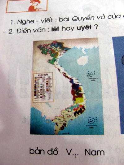 | Hình ảnh bản đồ đã thể hiện và chú thích rõ tên hai quần đảo Hoàng Sa, Trường Sa trong sách Tiếng Việt lớp 1, tập 2 bản vừa hoàn tất in sáng 22-3 |