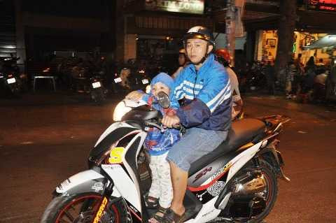 | Hai cha con mặc áo ấm ra đường. Ảnh: Phan Cường |