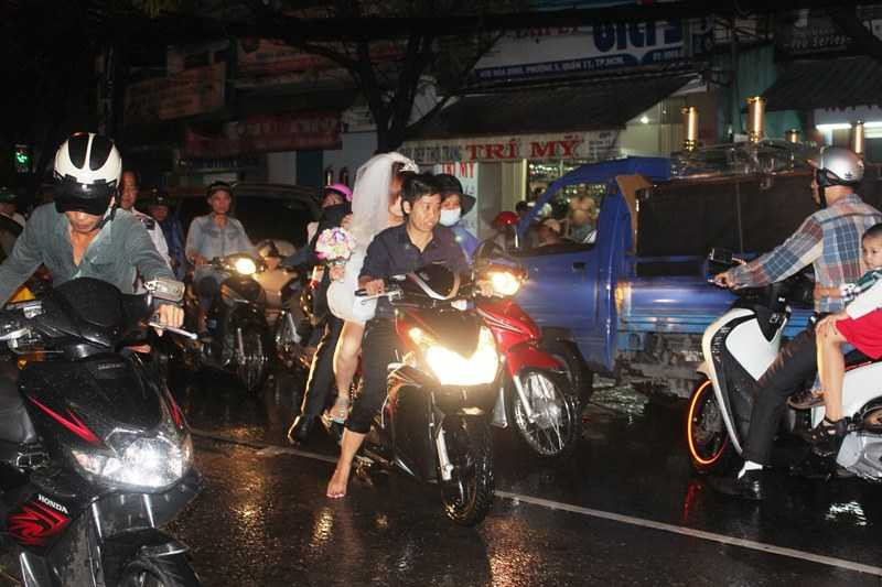 Ghi nhận thêm của phóng viên, nước ngập sâu trên tuyến đường Hòa Bình đã khiến hàng trăm xe chết máy bì bõm lội sông, do tuyến đường ngập nặng đã khiến giao thông qua khu vực bị tê liệt. Xe chở cô dâu và chú rể bị chết máy trên đường Hòa Bình buộc cô dâu và chú rể phải lội nước đen kịt, bốc mùi để đón xe ôm đến nơi tổ chức lễ thành hôn