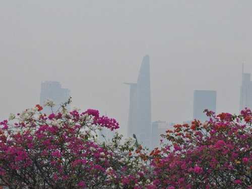 Các tòa nhà trung tâm Sài Gòn hướng nhìn từ quận 2 sang quận 1 chìm trong màn sương trắng đục