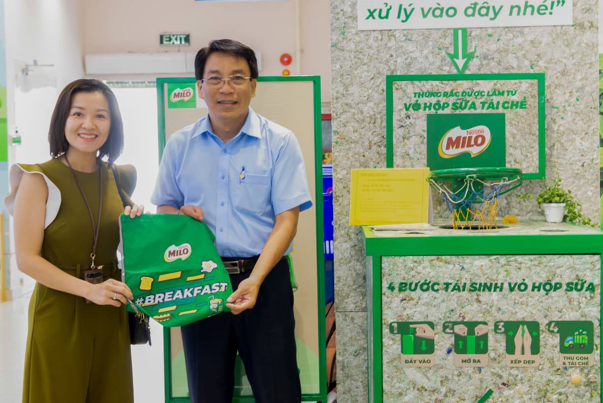 Ông Lê Trường Sơn - Phó Tổng Giám đốc Saigon Co.op trao quà cho khách hàng tham gia thu gom vỏ hộp sữa Milo