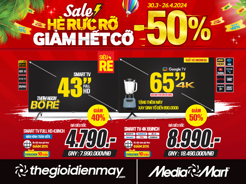 Từ nay đến hết 26/4, loạt tivi cao cấp “bay” ngay nửa giá: Smart tivi 43 inch thiết kế tràn viền giảm sốc 40%, giá bán ra chỉ còn 4,79 triệu đồng; chưa hết, chỉ từ 8,99 triệu đồng, quý khách hàng đã có thể sở hữu ngay 1 chiếc smart tivi 65 inch đến từ các thương hiệu như Sony, Samsung, LG, Coex, TCL…
