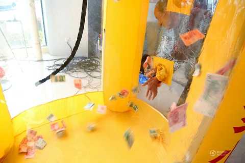Một cửa hàng xe ô tô ở Bình Lương (Hà Nam, Trung Quốc) vừa tổ chức cuộc vợt tiền trúng thưởng đặc biệt. Theo đó, tiền được cho vào một cái lồng rồi bị quạt gió thổi bay tứ tung cho khách vợt bằng tay.