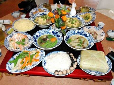 Mâm cơm đầu tiên của năm mới không thể thiếu đĩa thịt gà trống thiến, canh măng hầm hoặc canh bóng, miến, xôi, nem rán, thịt đông.