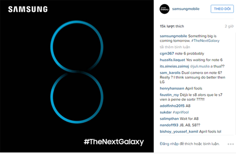 Samsung Mobile đăng tải bức ảnh trên Instagram kèm dòng chữ: “Một thứ to lớn sẽ xuất hiện vào ngày mai”. Nội dung bức ảnh là con số 8 và hashtag #TheNextGalaxy.