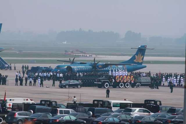 Mặc dù lượng người tới sân bay Nội Bài không ngừng tăng lên, nhưng không khí trang nghiêm, tang thương bủa vây nơi này. Mọi ánh mắt đang dõi về con đường, nơi linh cữu của Đại tướng sắp qua.