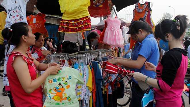| Công nhân tranh thủ mua quần áo giảm giá làm quà cho người nhà ở quê tại một chợ tạm trong Khu công nghiệp Đồng An (Bình Dương) |