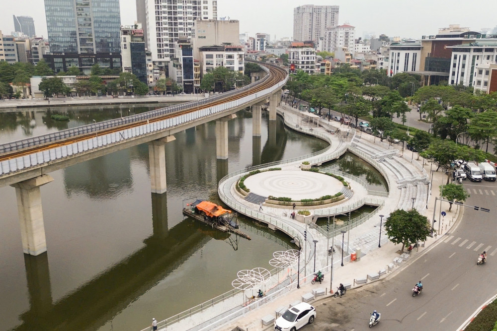 Vỉa hè ven hồ đã được lát đá tự nhiên, hệ thống lan can kính đang dần lắp đặt hoàn chỉnh cùng các tiện ích công cộng như ghế nghỉ, nhà vệ sinh, sân khấu nổi… cũng đang gấp rút hoàn thiện.