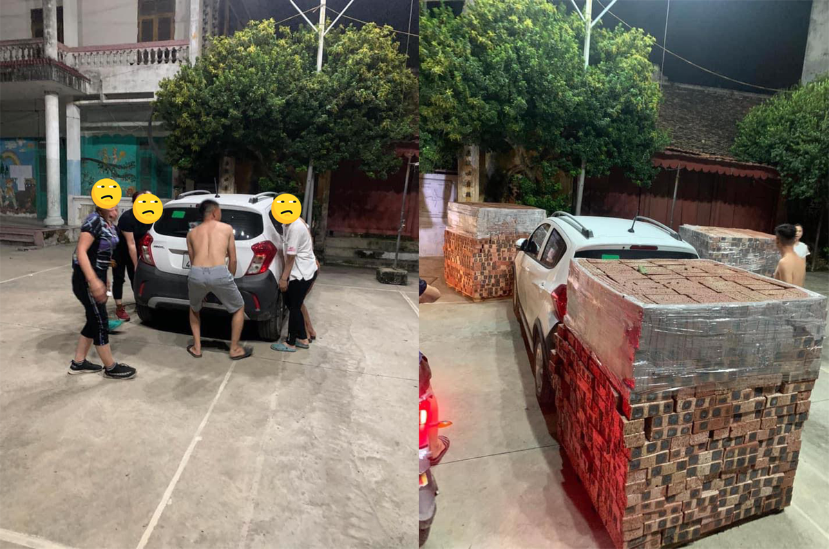 Lời chia sẻ tóm tắt: “đỗ xe ở sân thể thao của làng, gọi không được bà con cẩu cả gạch ra chắn”, và người đăng cũng không quên đính kèm hình ảnh cận cảnh chiếc xe đang ở trong một vị trí khá "kém duyên".
