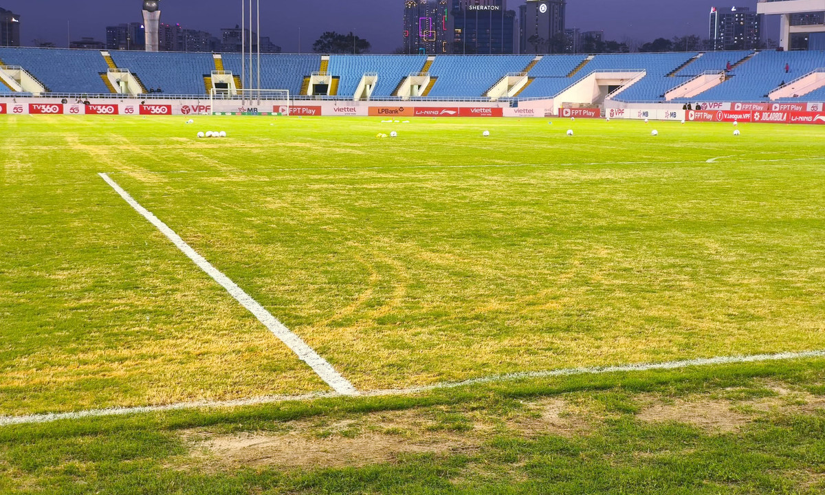 Mặt cỏ sân Mỹ Đình gồ ghề, loang lổ.