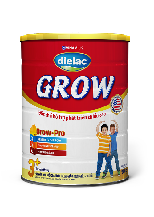 Dielac Grow với công thức Grow-Pro là thành quả nghiên cứu của các chuyên gia dinh dưỡng hàng đầu Vinamilk, chứa thành phần dưỡng chất vượt trội theo nhu cầu dinh dưỡng khuyến nghị DRI Mỹ, phù hợp với từng giai đoạn phát triển của trẻ (1-3 tuổi và 3-10 tuổi). Dielac Grow giúp trẻ phát triển tốt về chiều cao, trí não, tăng cân và khỏe mạnh hơn.