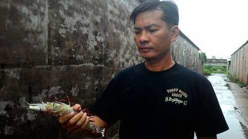 | Anh Huỳnh Văn Dũng, chủ một trại tôm ở Rạch Gốc với loài tôm sú bố mẹ 250 gram có giá giao động từ 4 - 6 triệu - Ảnh: Tư Tình |