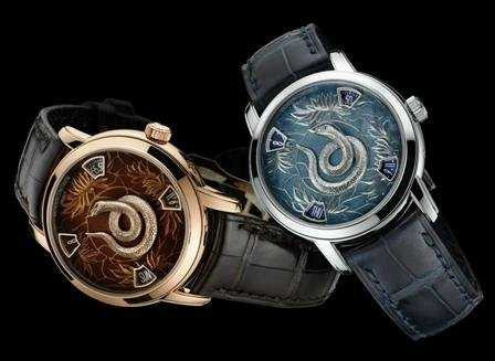 Lấy cảm hứng từ con rắn, con vật linh thiêng năm Quý Tỵ, hãng thời trang Vancheron Constatins tung ra bộ sưu tập đồng hồ đặc biệt chào đón năm mới. Bộ sưu tập gồm 24 chiếc đồng hồ với 2 phiên bản bạch kim và vàng, mỗi phiên bản 12 chiếc tượng trưng cho 12 con giáp.