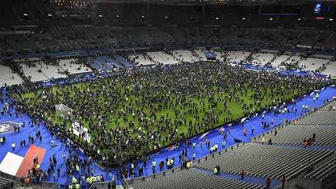 | Khán giả hoảng loạn chạy xuống sân bóng khi các vụ nổ xảy ra bên ngoài sân vận động Stade de France |