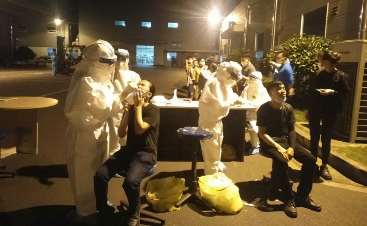 Lực lượng chức năng lấy mẫu xét nghiệm cho công nhân Công ty TNHH Shin young Việt Nam sau khi ghi nhận ca nhiễm COVID-19.