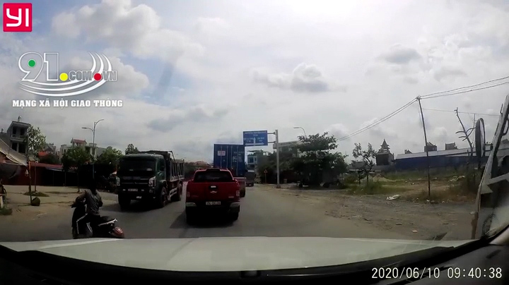 Người phụ nữ ở Hải Phòng điều khiển xe máy, không đội mũ bảo hiểm, sang đường thiếu quan sát suýt nữa bị xe tải cuốn vào gầm.